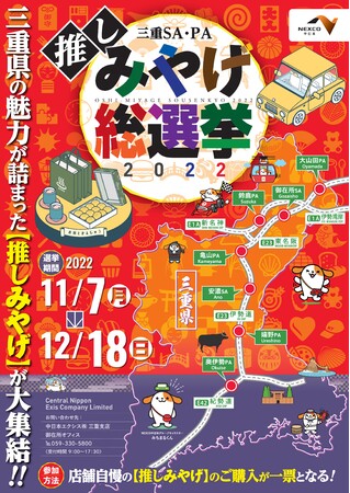 中日本エクシス株式会社 三重支店(三重県四日市市鵜の森、支店長・山本(やまもと)武司(たけし)は、E23 東名阪自動車道(東名阪道)、E1A 新名神高速道路(新名神)、E23 伊勢自動車道(伊勢道)、E42 紀勢自動車道(紀勢道)のサービスエリア(SA)・パーキングエリア(PA)の店舗(一部除く)にて、大好評であった「三重SA・PA 推し麺総選挙」、「三重SA・PA 推しテイクアウトグルメ総選挙」に続きSA・PA推しグルメ総選挙の第3弾として「三重SA・PA 推しみやげ総選挙」を開催します。