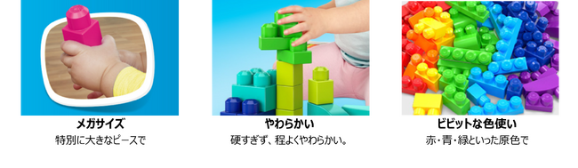 MEGA™は、世界No,2*の売上を誇る、カナダ生まれのブロック玩具ブランドです。その歴史は35年以上前、1才からでも遊べる”幼児向け”に特化したブロック玩具を、世界で初めて開発したことから始まります。小さな手でも遊びやすいようにと考えて設計された、特別大きいサイズのブロック”MEGA(R)BLOCKS(メガブロック)”は、私たちの最もアイコニックな商品として世界中で愛されています。”MEGA(R)BLOCKS(メガブロック)”の登場により、知育玩具として注目の集まるブロック遊びは、より早期から楽しめるものへと変わりました。現在は「1才からのメガブロック」シリーズにはじまり、さらに細かな表現を可能にする「MEGA™ ジュニア」や「MEGA™ワンダー」といった豊富なラインナップを取り揃え、お子さまの成長に合わせて選ぶことが可能です。また、すべてのシリーズで互換性があるため、組み合わせて長く使い続けることができます。MEGA™は、1才から始まり、すべての年齢のお子さまに寄り添い、適切な発達と成長をサポートし続けます。