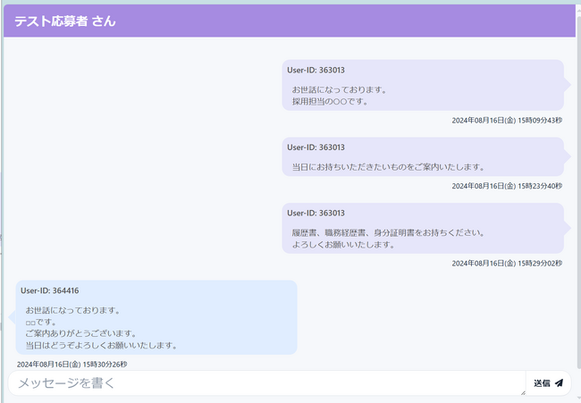 今回実装の双方向メッセージ機能は、ITSUMEN管理画面の応募者詳細画面上で応募者と双方向でコミュニケーションが取れるチャット形式の機能です。