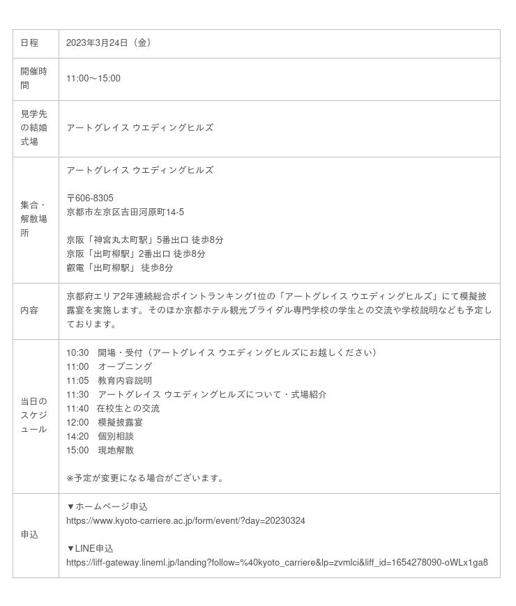 【京都ホテル観光ブライダル専門学校】3月24日(金)アートグレイス ウエディングヒルズにて高校生を対象とした「ブライダル見学フェスタ」を開催します