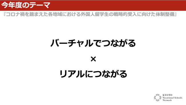 今回は今年度成果報告の後、京都府内の専修学校教職員やその留学生、日本語学校教員やその留学生を招き、「留学生が活躍できる未来のために」をテーマにパネルディスカッション形式で参加者に発信します。