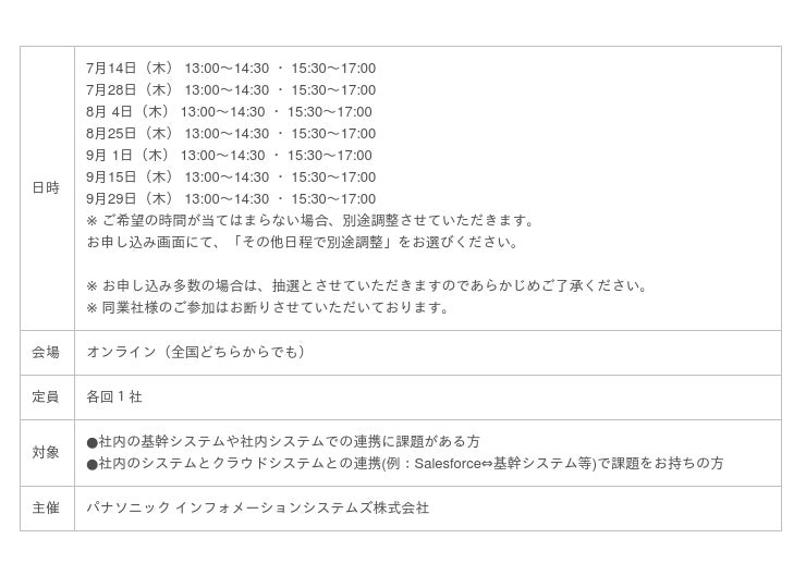 パナソニック インフォメーションシステムズ株式会社は、 2022年7月14日(木)から2022年9月29日(木)にかけて各回1社限定の、情報システム部門様向け システム連携 オンライン個別相談会を実施します。 ※好評につき期間延長しました。