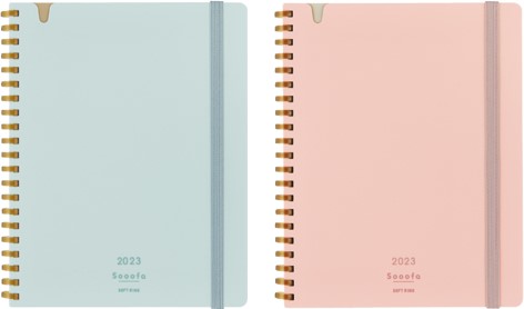 また、今回、ONでもOFFでも使いやすいノートとして人気のソフトリングノート「Sooofa」シリーズのダイアリーもラインアップに加わります。手が当たっても気になりにくいコクヨ独自のやわらかリングや、絶妙なカラーリング、ゴムバンドなどの多彩な機能性はそのままに、マンスリーのスケジュールページとノートがひとつになりました。4mm方眼罫のノートもたっぷり125ページついており、1冊でスケジュール管理と日々のメモやバレットジャーナルなど、用途は様々に一冊にまとめて使うことができます。サイズはB6変形サイズでカラーはライトブルー、ピンク、グリーン、ウォームグレーの4色を揃えています。