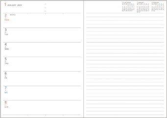 見開き左ページ縦に1週間の予定が書き込め、右ページはメモが書き込めるレイアウトのウィーウリータイプでは、くすみカラーを取り入れ、ファッションとも合わせやすくなっています。