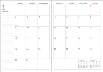 シンプルでスリムながら、マンスリーのスケジュールに、ノート部分がたっぷり80ページついたノート多枚数タイプです。マンスリースケジュールページに方眼罫と横罫のノート2種類を用意しています。カラーはそれぞれ方眼罫がブラック、クラフト、横罫のマンスリーがネイビーとホワイトの計4色です。