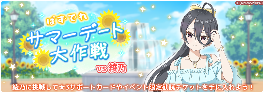 10月23日(木)よりイベント「ぱずでれサマーデート大作戦VS綾乃」を開催します。当イベントでは、イベントステージで集めたポイントで、イベント限定のサポートカードやアイテムが獲得できる「ポイント交換所」が登場。繰り返し挑戦してよりたくさんのポイントを集め☆3サポートカードや勧誘チケットを手に入れよう!