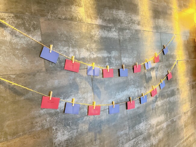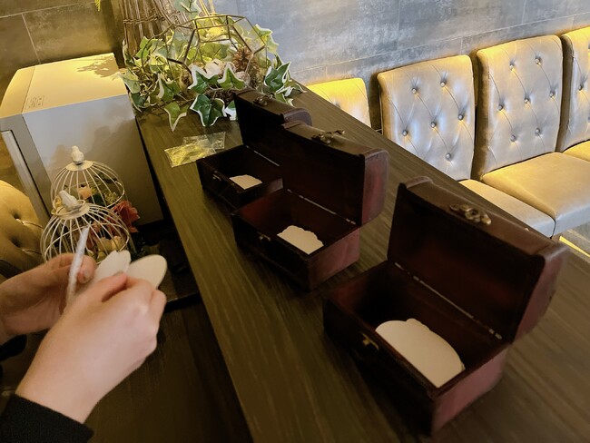 ORIENTAL KYOTO SUZAKU-TEI 朱雀邸のスタッフと学生からの手書きのメッセージを同封した手紙を壁に飾りました。封筒の表には新郎新婦様のお名前を書き、新郎新婦様宛の手紙を探していただくこともお楽しみいただきました。