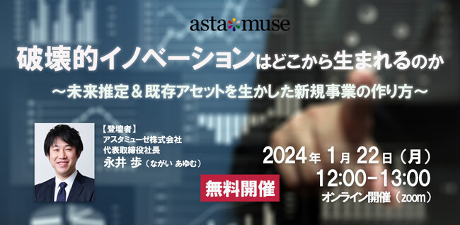 アスタミューゼ株式会社(本社:東京都千代田区、代表取締役社長 永井歩)は、2024年1月22日(月)12:00-13:00に、新規事業の企画や推進に関する課題をお持ちの経営者や担当者向けの無料ウェビナー「破壊的イノベーションはどこから生まれるのか 〜未来推定&既存アセットを生かした新規事業の作り方〜」を開催いたします。ご好評いただいたため2023年12月に続き再開催いたします。