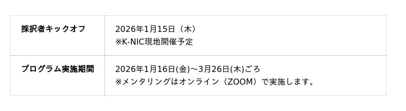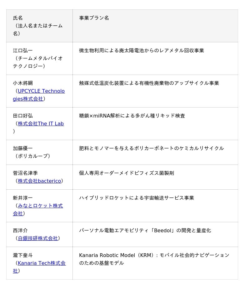 [表1: https://prtimes.jp/data/corp/33548/table/459_1_4e2e91bbbfe91efd2e221e3914d4615a.jpg?v=202512251115 ]ライフサイエンス、ロボティクス、環境・エネルギー、航空・宇宙といった幅広い分野から採択者が選定されました。2026年1〜3月末までの約2ヶ月間で、豊富な経験を持つメンター2名が徹底伴走し、事業のブラッシュアップを図ります。