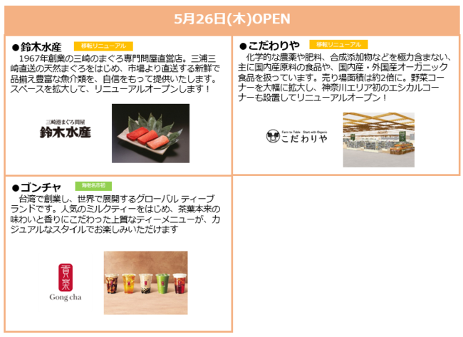 日常のお買い物に便利な青果・鮮魚などの食料品ゾーンの拡充に加え、お土産としても利用できる神奈川県内の人気スイーツ店などが仲間入り。季節ごとに話題の店舗が出店するポップアップショップも新設します。さらに、各店で購入した商品をその場で楽しめるイートインスペースも完備します。