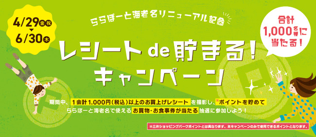 本リニューアルを記念し、2022年4月29日(金・祝)〜6月30日(木)の期間、合計1,000名様にららぽーと海老名で使えるお買物・お食事券が当たる「レシートde貯まる!キャンペーン」を開催します。