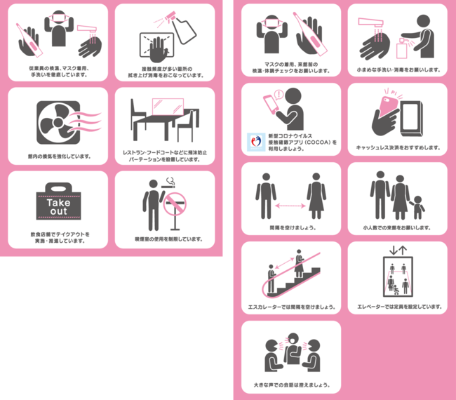 三井不動産グループが運営する商業施設では、新型コロナウイルス感染拡大防止のため、下記をはじめとした様々な取り組みを実施しております。