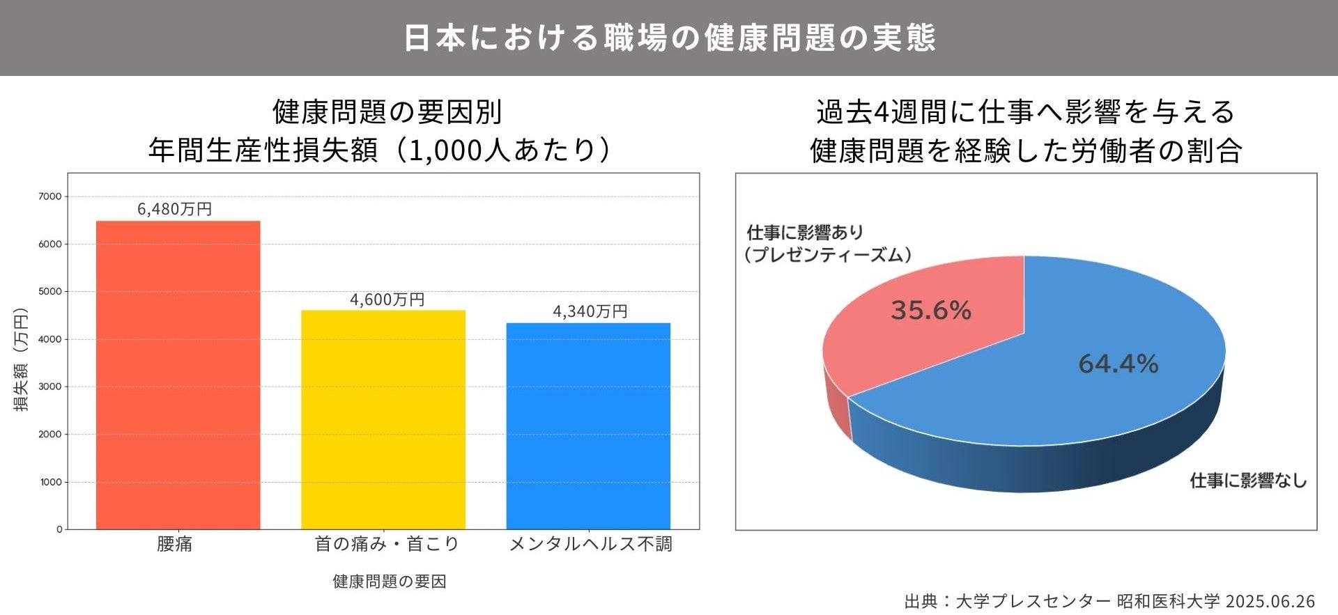 昭和医科大学らの研究チームが、厚生労働省の研究事業(厚生労働科学研究費補助金)として全国1万人の就業者を対象に実施した調査(2023年)では、35.6%の労働者が過去4週間に「健康問題によって仕事の質・量が低下する状態(プレゼンティーズム)」を経験しており、約3人に1人が本来のパフォーマンスを発揮できていない実態が示されました。最大の要因は腰痛であり、腰痛による生産性低下は、労働者1,000人あたり年間約6,480万円の経済的損失に相当するという試算が報告されています*。