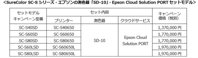 エプソン販売株式会社は、エコソルベントインク搭載大判インクジェットプリンター「SureColor SC-Sシリーズ」とエプソンの測色器「SD-10」、クラウドサービス「Epson Cloud Solution PORT」(無償版)※がお得に購入できる『エコソルベントインク搭載プリンター各種 エプソンの測色器 × Epson Cloud Solution PORTセットモデルキャンペーン』を2022年9月1日(木)から開始します。