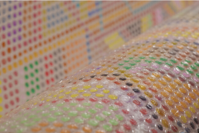 東本憲子 (HIGASHIMOTO Noriko) 1983-大阪府生まれ。大阪市にある「西淡路希望の家」に所属。織物をはじめ、イラスト作品など様々な作品を制作している。気泡緩衝材(エアキャップ)の気泡に、油性カラーペンや水性インクペンを用いて細かく塗り分けながら直線や面が繋がり、幾何学模様は生み出されている。エアキャップロール1本を使い、端から端まで細かく塗られている。気泡をじっくり見つめると、綺麗な丸ばかりだけではなく、ツノのようにすこし丸からはみ出した部分があるなど、気泡一つひとつそれぞれ異なっており、東本が制作をしている時の息遣いも感じられるようである。さらに、エアキャップのロールを広げると、幾何学模様の中に、桜の花のような模様やクリスマスツリーのような木が、点在して現れる。家族で様々な所に出かけることが多い東本にとって、エアキャップの気泡から生まれた模様は、まるで過ごした時間や見たものたちの記憶を大切に包みこんでいるようである。主な展示に、「北九州未来創造芸術祭」(北九州市立美術館(本館)[福岡県]他、2021年)などがある。