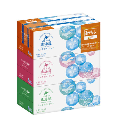 北海道で生産し、道内限定で販売しているご当地ブランド「エリエール北海道」は、昨年10月、『エリエール北海道ティシュー なまらたっぷり』を発売。北海道では全国と比較して、「まとめ買い」や「会社やお出かけ帰りに買う」ことが多い※2ことから、車でのお買い物やまとめ買いに便利な300組5箱の大容量パック(従来品の2倍※3入り)として販売し、好評をいただいています。また、北海道とのタイアップ事業として、北海道の若者の海外留学を支援する「ほっかいどう未来チャレンジ基金」(p3参照)へ売り上げの一部を寄付しました。新発売の4商品についても、売り上げの一部を同基金に寄付いたします。