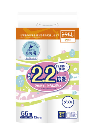 『エリエール北海道トイレットダブル なまらたっぷり2.2倍巻』および芯に消臭成分と香料を配合した『エリエール北海道トイレット消臭 なまらたっぷり2倍巻』は、まとめ買いに便利な長巻であることに加え、ロール幅105mm(従来品114mm)のエコサイズでお届けします。パッケージは、自然豊かな北海道をイメージしたデザインに仕上げました。