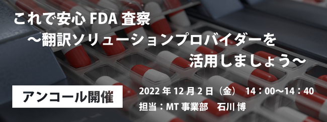 高精度AI自動翻訳の開発・運営を行う株式会社ロゼッタ(本社:東京都千代田区 代表取締役:渡邊 麻呂)は、無料ウェビナー『これで安心FDA査察 〜翻訳ソリューションプロバイダーを活用しましょう〜 (アンコール開催)』を2022年12月2日(金)に開催いたします。