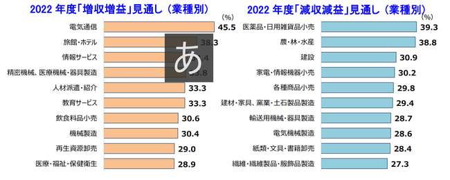 2022年度の業績見通しを「増収増益」とする企業は、前回調査(2021年3月)の2021年度見通しから3.3ポイント減少し24.1%となった。一方、「減収減益」を見込む企業は同2.1ポイント減少の23.9%。2022年度の業績見通しは増収傾向が見られるが、利益面で厳しさも。業種別にみると、「増収増益」はネット通信環境の整備などを含む「電気通信」が45.5%でトップ。「減収減益」は、薬価改定などの影響を見込む「医薬品・日用雑貨品小売」が最も高かった
