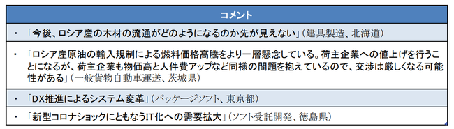ロシア・ウクライナ情勢による影響を懸念する企業が多い一方、新型コロナ下におけるテレワークの広がりやDXの推進などデジタル化の需要拡大を上振れ材料とする意見もみられた。