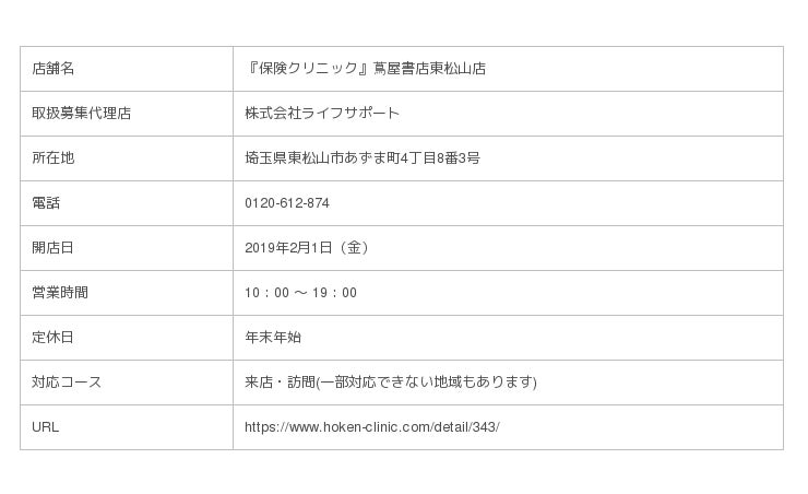 『保険クリニック』蔦屋書店東松山店2月1日(金)オープン!