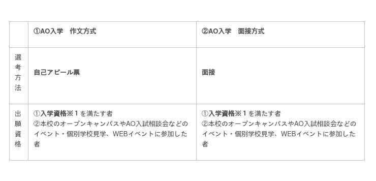 2.面接方式・作文方式の2種類のAO入試方法から自分に合ったものを選択可能