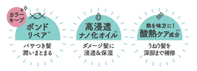 *1 髪表面を補修して整える *2 ラウロイルグルタミン酸ジ(フィトステリル/オクチルドデシル)、アルガニアスピノサ核油 、スクレロカリアビレア種子油 (全て保湿成分)*3 レブリン酸、マレイン酸(全て補修成分)