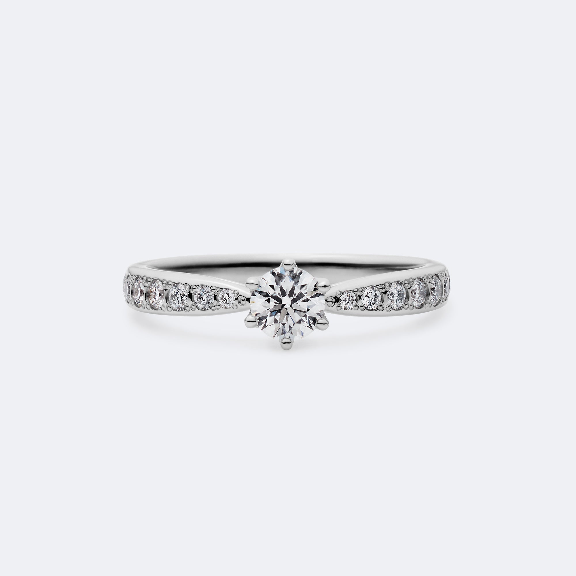 ヴァンドーム青山で永く愛されているシリーズの4本爪の石座を、エタニティタイプのアームにあしらった、シンプルかつラグジュアリーなエンゲージメントリング。