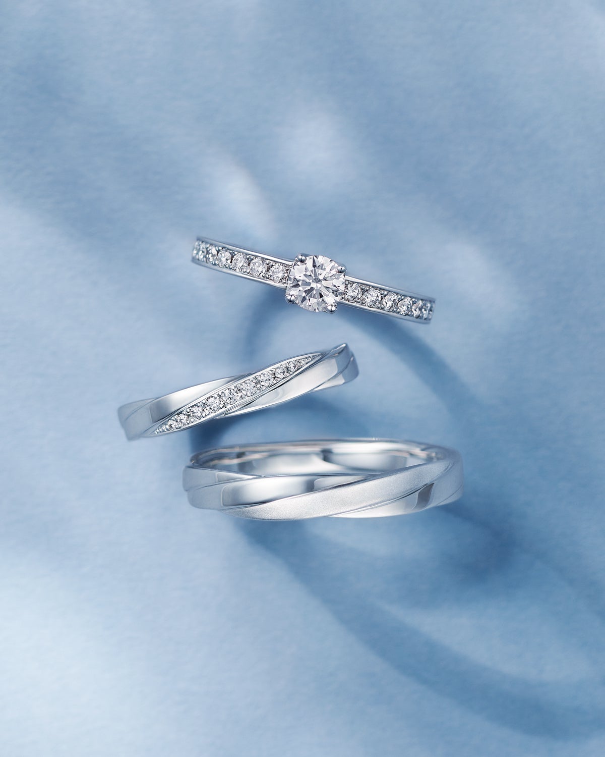 上から:エンゲージメントリング¥352,000〜(Pt950,Diamond0.15ct〜)、マリッジリング¥181,500〜(Pt950,Diamond〈ハート&キューヒ゜ット゛〉)*スコープ付、マリッジリング¥159,500〜(Pt950)