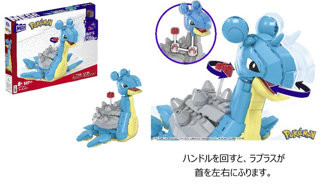 ラプラスと一緒に海の冒険にでかけよう!合計527ピースのブロックで精巧なラプラスを自分で組み立てられる歯車ブロック付きシリーズ。歯車ブロックに連結したハンドルを回すと、ラプラスが首を左右にふったり、背中を押して動かすとヒレもスイスイ動きます。また、首・ヒレ・尻尾は可動式で、好きなポーズをとって遊べます。組み立てた後も楽しめる、おどろきのギミックで、お子さまの想像力をかき立てます。他のメガ ポケモン アドベンチャーワールド 歯車ブロック付きシリーズ と組み合わせて遊べば、さらにポケモンの世界が広がります。