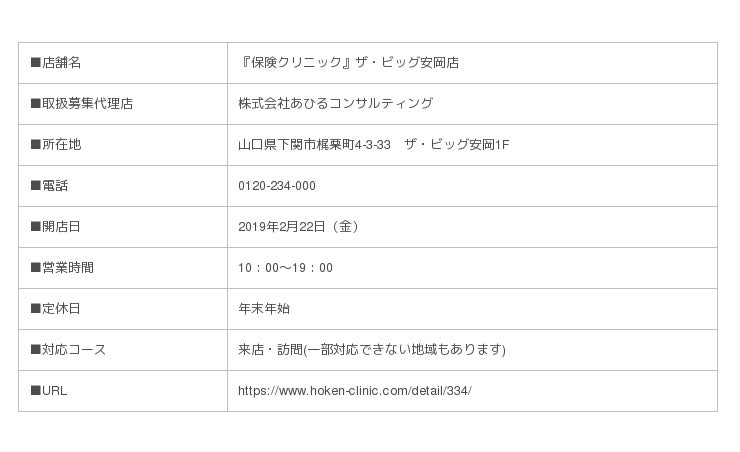 「人と保険の未来をつなぐ 〜Fintech Innovation〜」をかかげ、保険販売事業、ソリューション事業、システム事業を手掛ける株式会社アイリックコーポレーション(本社:東京都文京区 代表取締役:勝本竜二、証券コード:7325、以下「当社」)と株式会社あひるコンサルティング(本社:福岡県北九州市 代表取締役:野田大吾郎)は、『保険クリニック』下関駅前店を『保険クリニック』ザ・ビッグ安岡店として2月22日(金)に移転オープンいたします。(全国187店舗、中国地区で13店舗、山口県で1店舗 2019年2月22日時点)