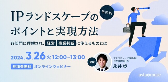 アスタミューゼ株式会社(本社:東京都千代田区、代表取締役社長 永井歩)は、2024年3月26日(火)12:00-13:00に、事業会社の知財担当者、R&D部門の方々を対象とした無料ウェビナー「目的別IPランドスケープのポイントと実現方法 〜各部門に理解され、経営・事業判断に使えるものとは〜」を開催します。ご好評につき過去複数回実施した同タイトルのウェビナーを3月にも再開催いたします。