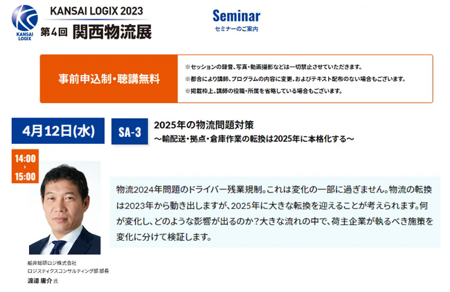 2023年4月12日(水)〜14日(金)の計3日間、インテックス大阪にて開催された「第4回 関西物流展 KANSAI LOGIX 2023」の特別セミナーにて、船井総研ロジ株式会社(東京本社:東京都千代田区、代表:菅重宏、以下「船井総研ロジ」)の物流コンサルタント 渡邉 庸介が「2025年の物流問題対策 〜輸配送・拠点・倉庫作業の転換は2025年に本格化する〜」をテーマに講演いたしました。渡邉の講演は展示会1日目の4月12日(水)14:00-15:00に行いました。