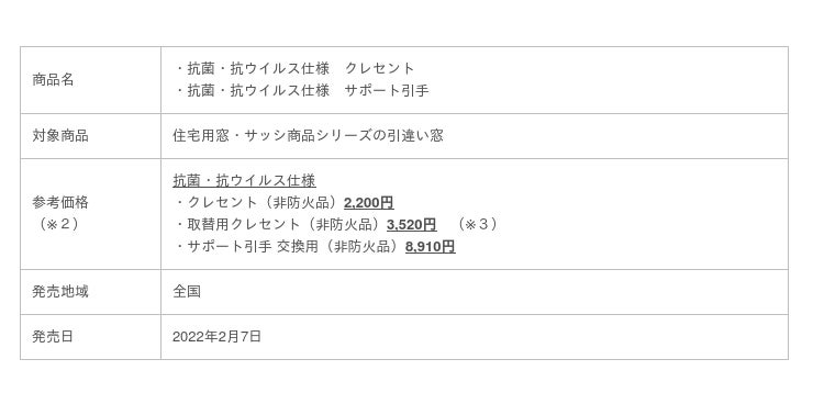 YKK AP株式会社(本社:東京都千代田区、社長:堀 秀充)は、住宅用引違い窓のオプション部品として、抗菌・抗ウイルス加工を施した「クレセント」「サポート引手」を、2022年2月7日から発売します。