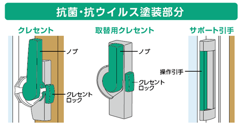 対象は、住宅用引違い窓の操作部品のうち「クレセント」「サポート引手」で、SIAA(抗菌製品技術協議会)の抗菌加工および抗ウイルス加工の認証を取得(※1)しています。クレセントはノブとクレセントロックに、サポート引手は操作引手に塗装を行い、製品の表面上における細菌の増殖を抑制する抗菌加工と、製品上の特定ウイルスの数を減少させる抗ウイルス加工を施しています。