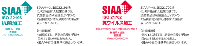 ※1:SIAAにて以下の抗菌・抗ウイルス加工認証を取得しています。
