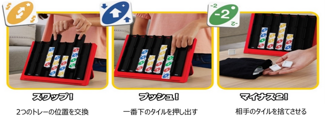 カードではなくタイルを並べてプレイする「ウノ クアトロ ならべてフォー」、ボールを指示通りに完成させ相手ボールをクラッシュさせる「バウンス・オフ・デュエル」7月29日(土)より発売