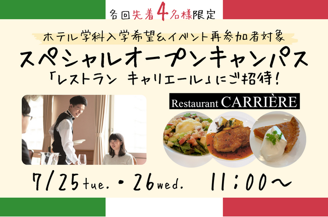 京都ホテル観光ブライダル専門学校は2023年7月25日(火)・26日(水)に進路活動の一環としてレストランが体験できるスぺシャルオープンキャンパスを実施します。学生が運営する「レストランキャリエール」のランチコースを無料でお楽しみいただけるだけでなく、学科教育内容説明やミニテーブルマナー講座も予定しています。