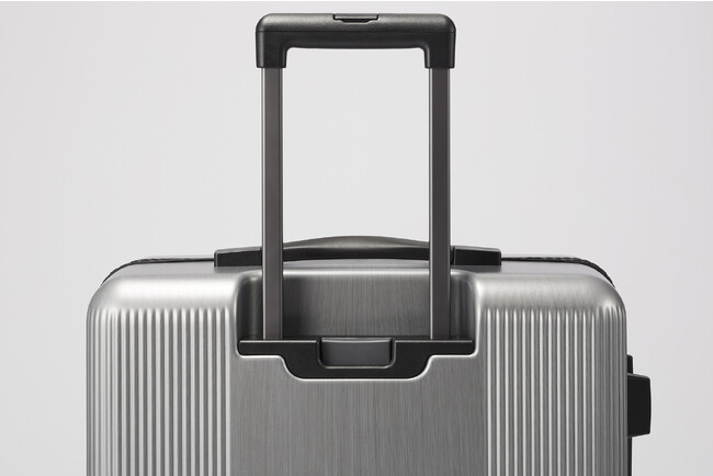 グリップ部分は人間工学に基づく握りやすい楕円型で、使用感が向上します。スーツケースは製造上ハンドル取り付け位置をボトム側に寄せることが多く、持ち上げた際にスーツケースが傾き、ハンドルの握りやすさが損なわれていました。そこで、自然な握りを実現できるよう、予めグリップ部分に傾斜を設けています。