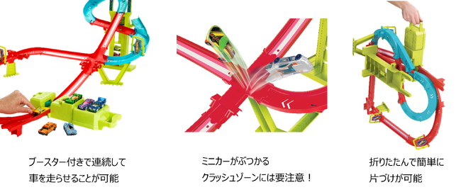 レール内に車を連続して走らせることができるブースターが付いた新しいプレイセットです。レール内にあるクラッシュゾーンでは、ミニカーがぶつかる恐れがあるため、連続して車を走らせながらミニカーをぶつけず、何台走らせることができるのかドキドキ感を味わえます。