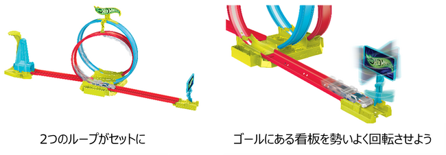 色鮮やかなネオンが特長的な2つのループがセットになった新しいプレイセットです。ループが2つになったことで、さらにスピードアップし、レースの臨場感を味わえます。ループをクリアして、ホットウィールの看板を回転させればゴールとなります。セットにはミニカーが1台ついているので、買ってすぐに遊ぶことができます。