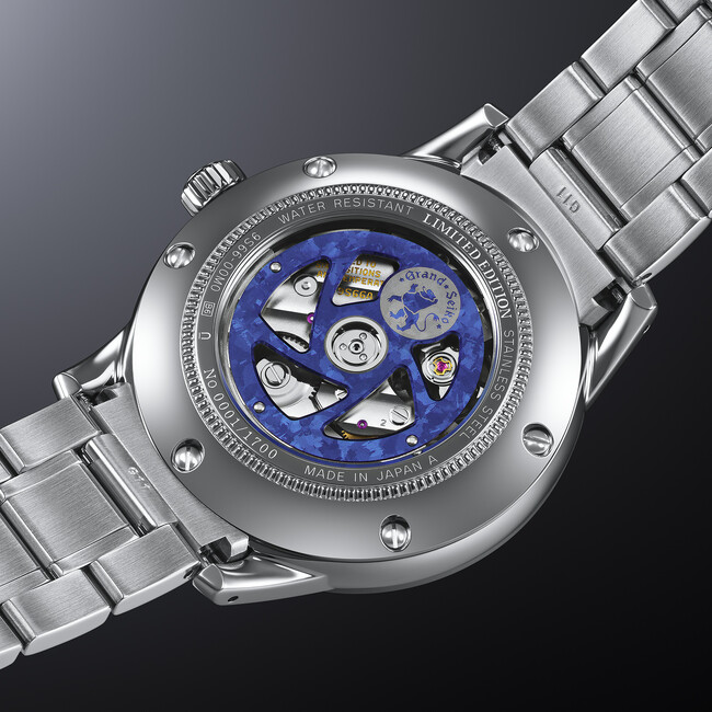 さらに、20気圧防水のメカニカルウオッチで初めてのシースルーバックを採用することで、裏ぶたを通じて、25周年記念限定の特別仕様である回転錘を見ることができます。グランドセイコーの獅子のエンブレムがあしらわれた、陽極酸化処理による爽やかなスカイブルー色の回転錘は、ダイヤルと同様に、雲海が広がる美しい青空を表現しました。