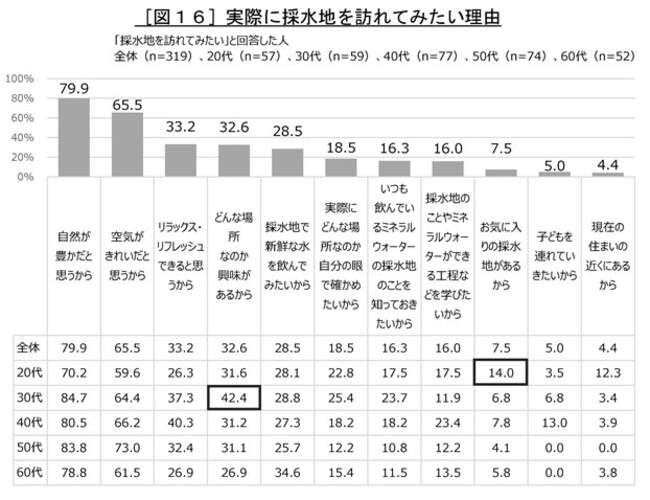 訪れてみたい理由は、「自然が豊かだと思うから」(79.9%)が約8割となり、美しい自然環境に引かれる人が多いようです。20代は「お気に入りの採水地があるから」(20代:14.0%)が他の世代より高く、30代は「どんな場所なのか興味があるから」(30代:42.4%)などの項目で全体よりもポイントが高く、若い世代ほど採水地の自然や環境への興味関心が高い様子がうかがえる結果となりました。(図16)