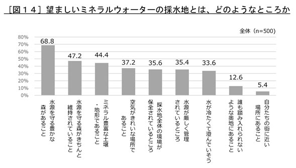 「望ましいミネラルウォーターの採水地」がどのようなところだと思うかを聞くと、1位「水源を守る豊かな森があること」(68.8%)が約7割となり、2位「水源を守る森がきちんと維持されていること」(47.2%)もあわせて、水源の豊かな自然環境が守られることを望む声が多く集まりました。(図14)