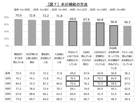 20代・30代では、「汗をかいていなくても水を飲むようにしている」(20代:76.5%、30代:75.5%)、「1日のなかで定期的に水を飲むようにしている」(20代:75.3%、30代:71.3%)、「外出時、水を持ち歩き、いつでも水分補給できるようにしている」(20代:65.9%、30代:59.6%)が、それぞれ全体より多く回答されており、若い世代の日常生活の中に水を飲むことによる水分補給を心掛けている人が多いことがうかがえます。(図7)