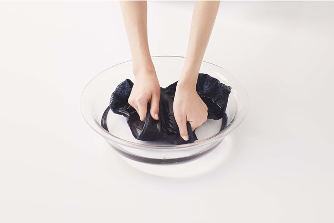 1.ぬるま湯に20分ほど浸し、汚れが出なくなるまで、手で押し出すように優しくもみ洗いします。