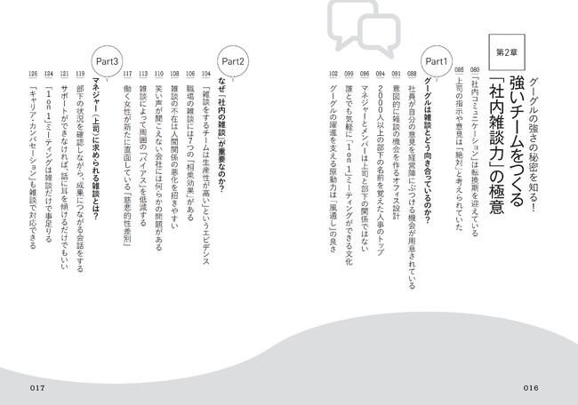本書では、Googleなどで実践されていることを紹介しながら、上司に求められる雑談、部下に求められる雑談について、わかりやすく解説しています。