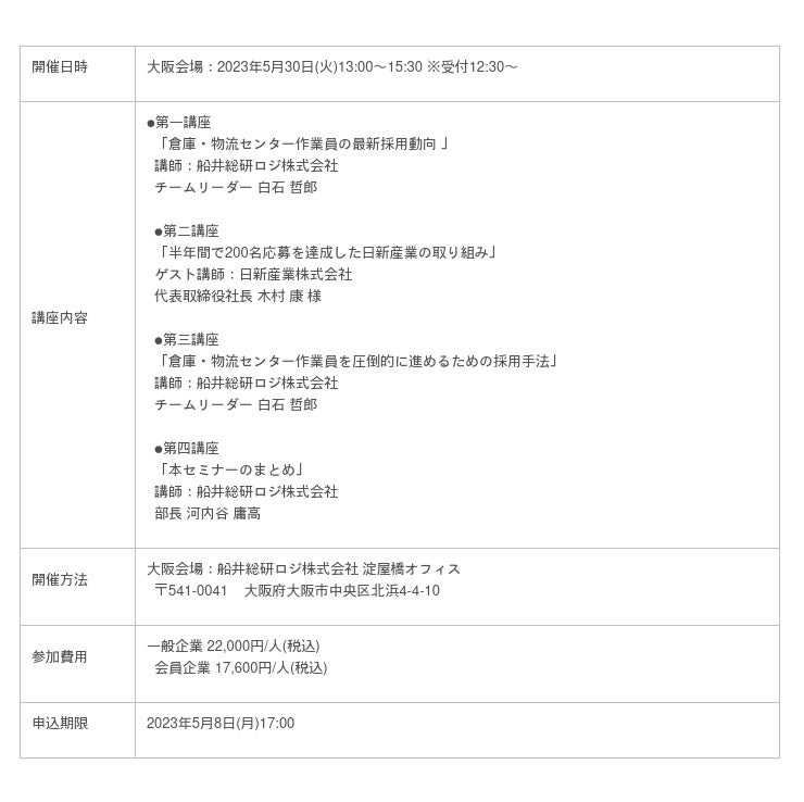 【倉庫・物流センター作業員の採用動向を解説】第2回 倉庫・物流センター作業員採用革新セミナーを2023年5月30日(火)に大阪・淀屋橋で開催します|物流コンサルの船井総研ロジ