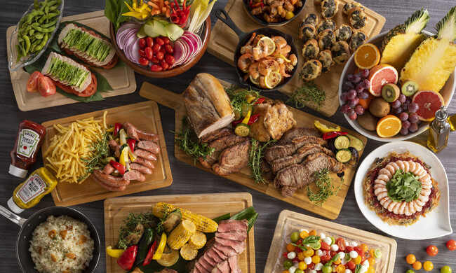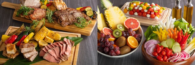 鉄板焼きビーフステーキ、ローストポークの鉄板焼き、炙りチキン、中国料理「麗花」監修の酢豚、ガーリックシュリンプ、シュリンプサラダ、バンバンジーサラダ、スティック野菜、鶏のから揚げ、モッツァレラチーズとトマトのサラダ、蟹風味のスパニッシュオムレツ、ソーセージと野菜のソテー、とうもろこし、ガーリックライス、アゴーラ黒カレーのチーズトースト、アゴーラ黒カレー、ソフトクリーム、プリンなど約35種