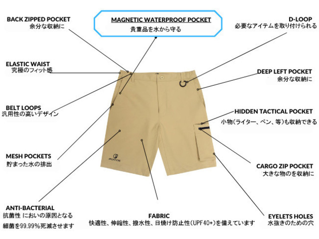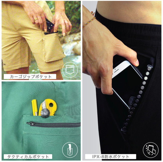 【Irontide】(アイロンタイド)は、最高等級IPX-8の防水ポケット付きのアドベンチャーパンツです。計5つの便利なポケットを装備し、置き場に困りがちな時計や携帯・財布・鍵などの貴重品類を手元でしっかり管理できます。また生地にはバクテリアの増殖を抑制する特殊加工を施しており、汗や生乾きの嫌な臭いを軽減します。かさばらず速乾性に優れ、釣りやキャンプ、山登り、カヤック、ヨガなど、多種多様なアクティビティに最適な一着です。